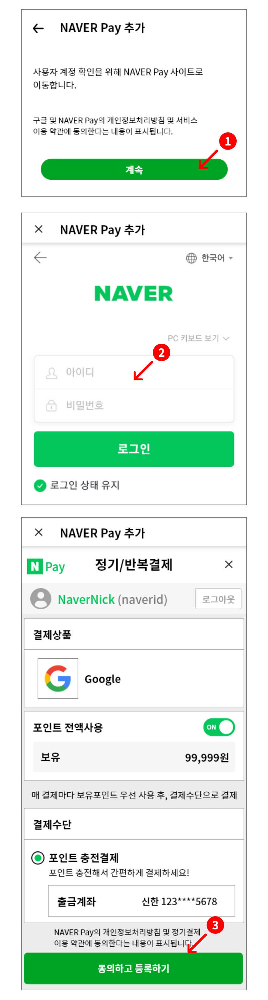 NAVER Pay 추가 화면에서 ①[계속] 버튼을 누르면 네이버 로그인 화면이 나타납니다.