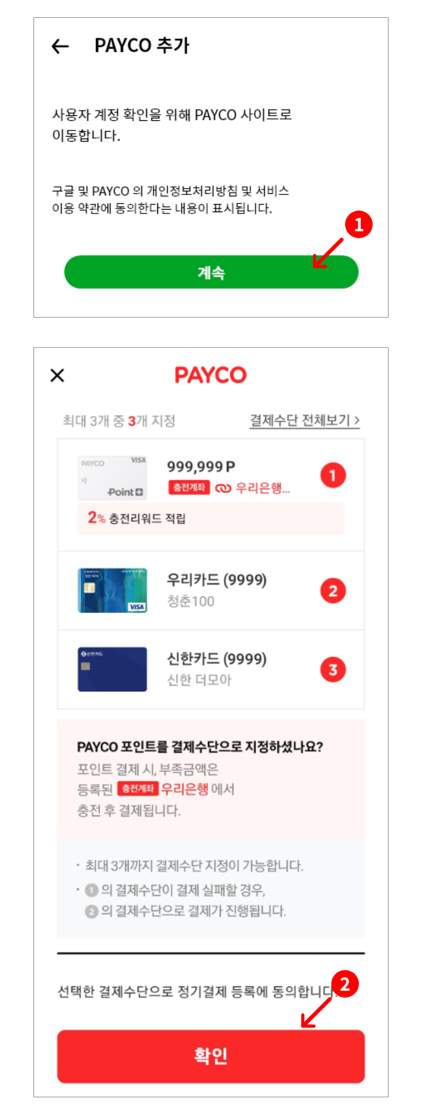 PAYCO 추가 화면에서 ①[계속] 버튼을 누르면 페이코 정기결제 등록 화면이 나타납니다.