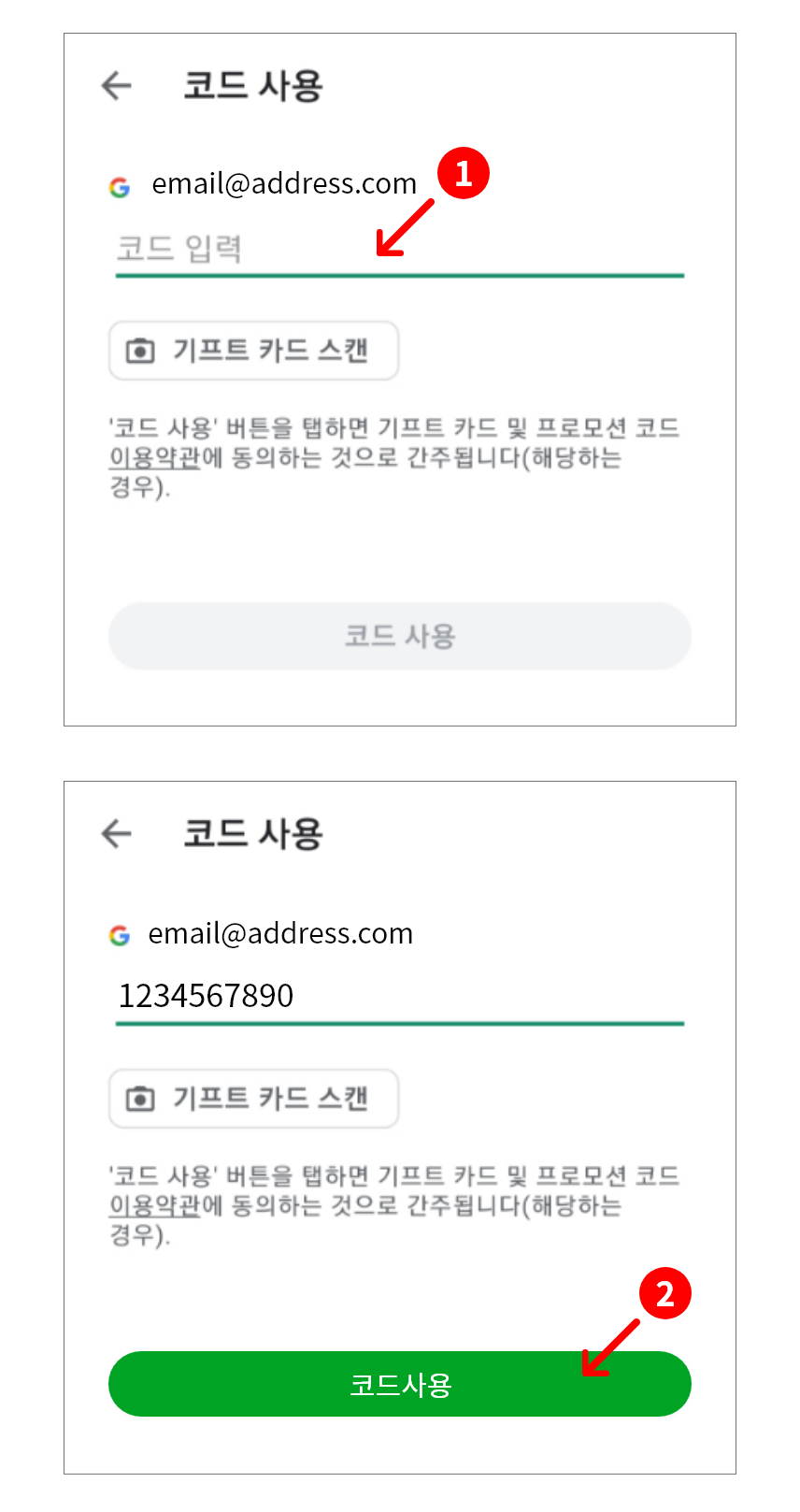 구글 기프트카드는 온라인 쇼핑몰이나 편의점에서 구입한 기프트카드에 적힌 ①일렬번호를 입력하고 ②[코드사용]을 누르면 기프트카드의 금액만큼 등록이 되고 구매 및 정기결제에 사용할 수 있습니다.
